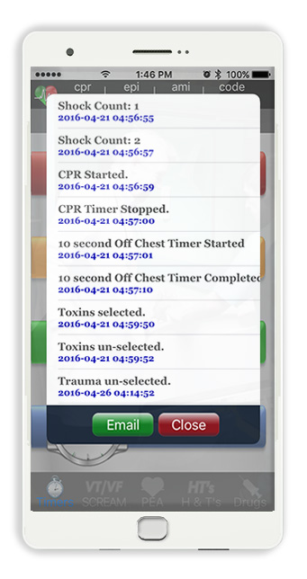 CARMA also features a logging process that automatically tracks all activities within a session. They include timer starts and stops, H's and T's selections, rhythm, medication and non-drug intervention selections. Each event is time stamped for easy review. In addition, the session log can be easily emailed for archiving purposes. In conformance with HIPAA requirements, no patient information is stored in the log and the log does not reside in the physical space of the mobile device. Once the application exits or is reset, the log is deleted.