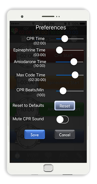 CARMA includes an audible CPR metronome which defaults to 100 beats/minute, and timers for Epinephrine, Amniodarone and code duration. The duration timer prompts the leader to reevaluate every 30 minutes. Each timer has a unique vibrate feature when it completes its cycle. All of CARMA's timer durations, rates and audible features are configurable through CARMA's preferences menu.